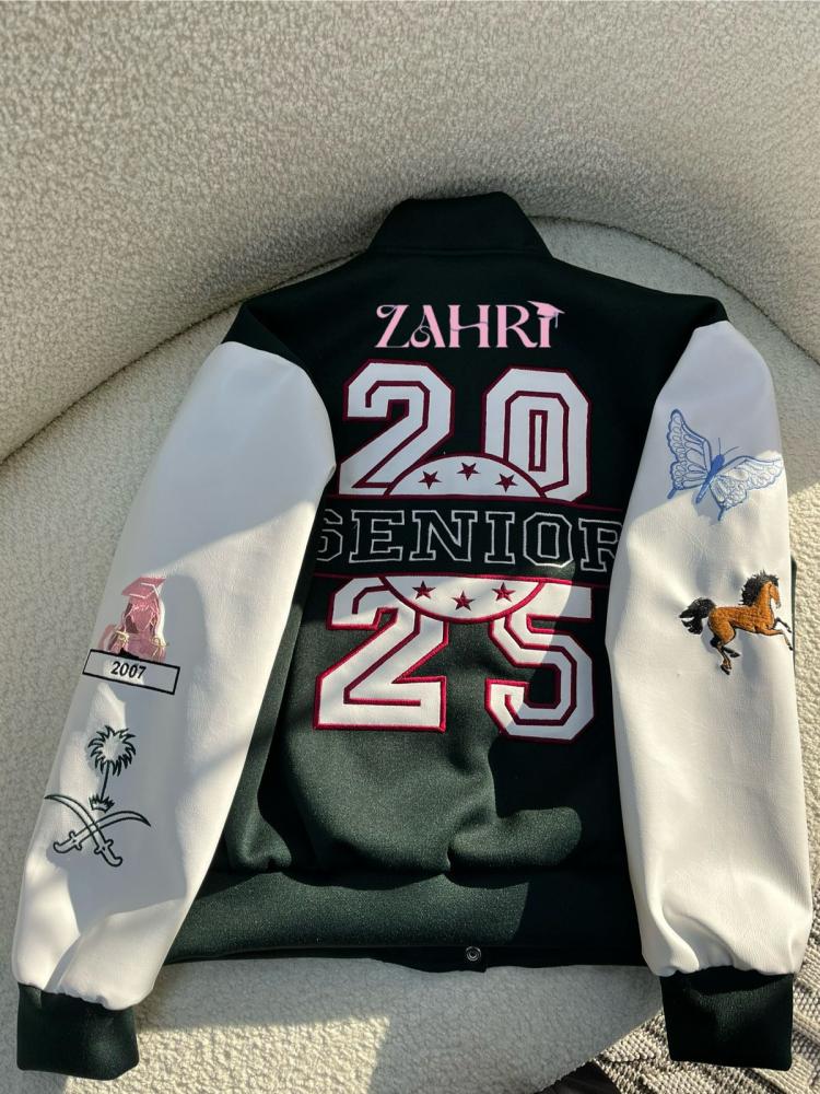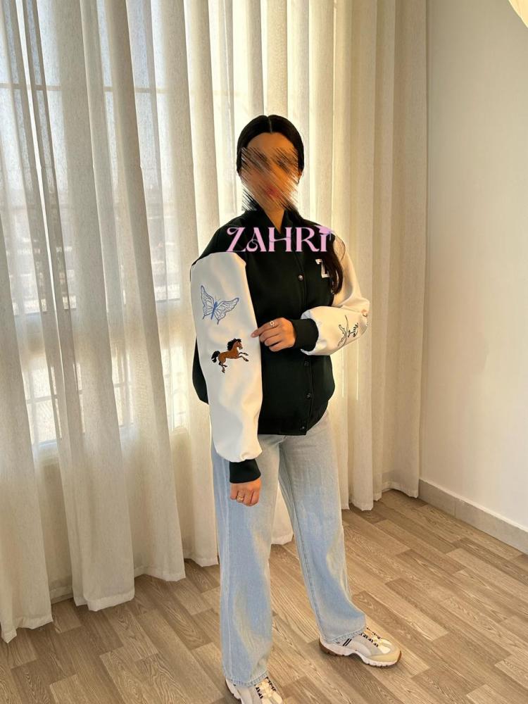 جاكيت سينيور زهري - لون اخضر زيتي بأكمام بيضاء جلد