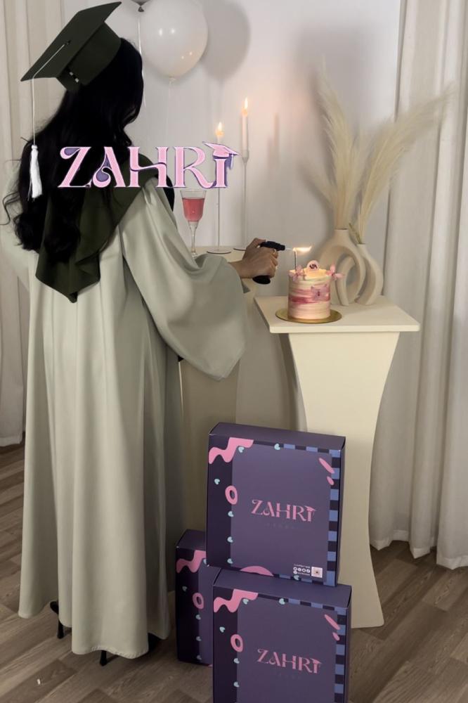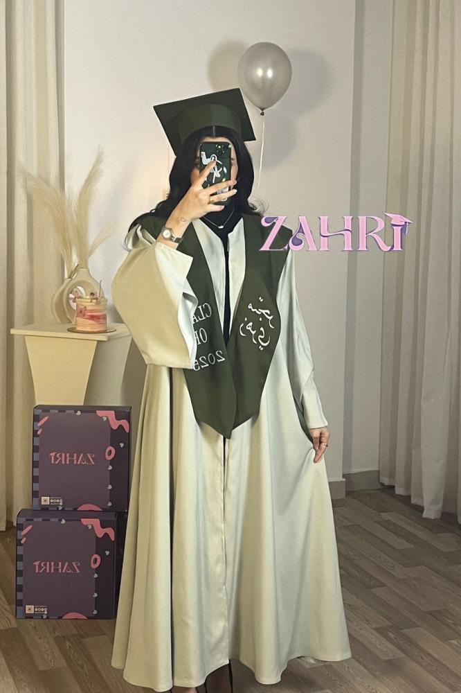 عباية تفاحي بفتحة كم ووشاح زيتي مطرز وكاب