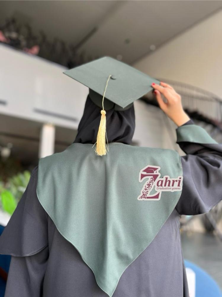 عباية سوداء بأطراف زيتيه + وشاح مطرز وكاب