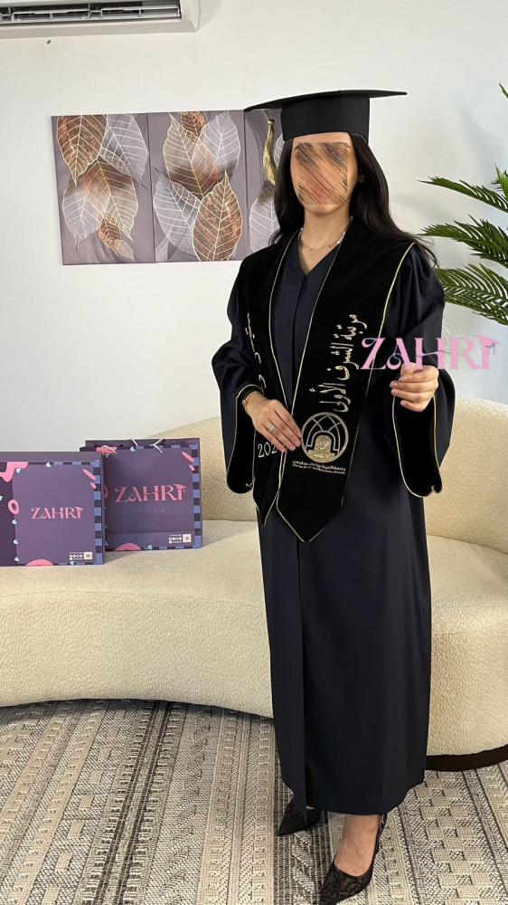 عباية كحلي محددة بقيطان ذهبية ووشاح اسود مخمل مطرز وكاب